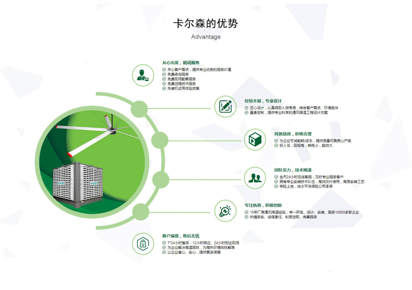 ??晉江市卡爾森機電設(shè)備有限公司是一家集設(shè)計、制作、銷售、安裝工業(yè)通風(fēng)設(shè)備、中央空調(diào)、節(jié)能環(huán)保空調(diào)、脈沖除塵設(shè)備、環(huán)境凈化工程、等環(huán)保工程企業(yè)。并提供環(huán)境影響評價、環(huán)保工程總承包、環(huán)保工程設(shè)計、環(huán)保工程運營、環(huán)保工程成套設(shè)備等一站式服務(wù)。公司一直誠心服務(wù)于工業(yè)廠房的通風(fēng)設(shè)施,我們的產(chǎn)品:“品種齊全、質(zhì)量優(yōu)越”。根據(jù)客戶的需求精心設(shè)計,高質(zhì)量的制造,力求使每個產(chǎn)品都達到合理耐用、節(jié)能環(huán)保。科學(xué)的設(shè)計和精美高品質(zhì)的產(chǎn)品,完善的服務(wù)系統(tǒng),加強售前、售中、售后服務(wù),對顧客在使用商品中出現(xiàn)的各種問題及時解決,使顧客無后顧之憂。產(chǎn)品廣泛適用于各類型制造業(yè)、機械類、五金冶煉、食品、化工、電子、紡織、噴涂、娛樂以及服務(wù)等場所。我們秉承“質(zhì)理過關(guān)、價格合理、交期準(zhǔn)時、服務(wù)周到”而受到新老客戶的好評和信賴。我們堅持“客戶至上、質(zhì)量上乘”為宗旨,努力工作,為您換來潔凈美好的明天。卡爾森愿以過硬的質(zhì)量,良好的信譽同各界朋友一起開創(chuàng)更加輝煌的未來。